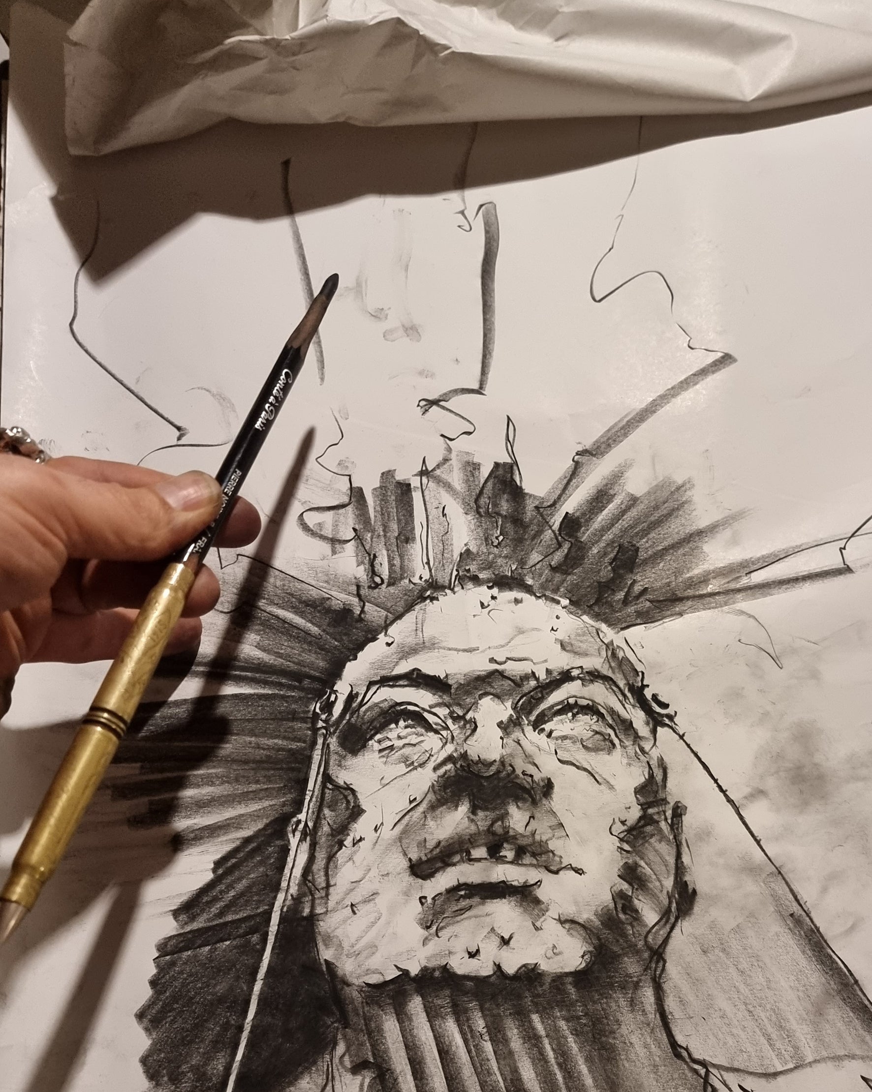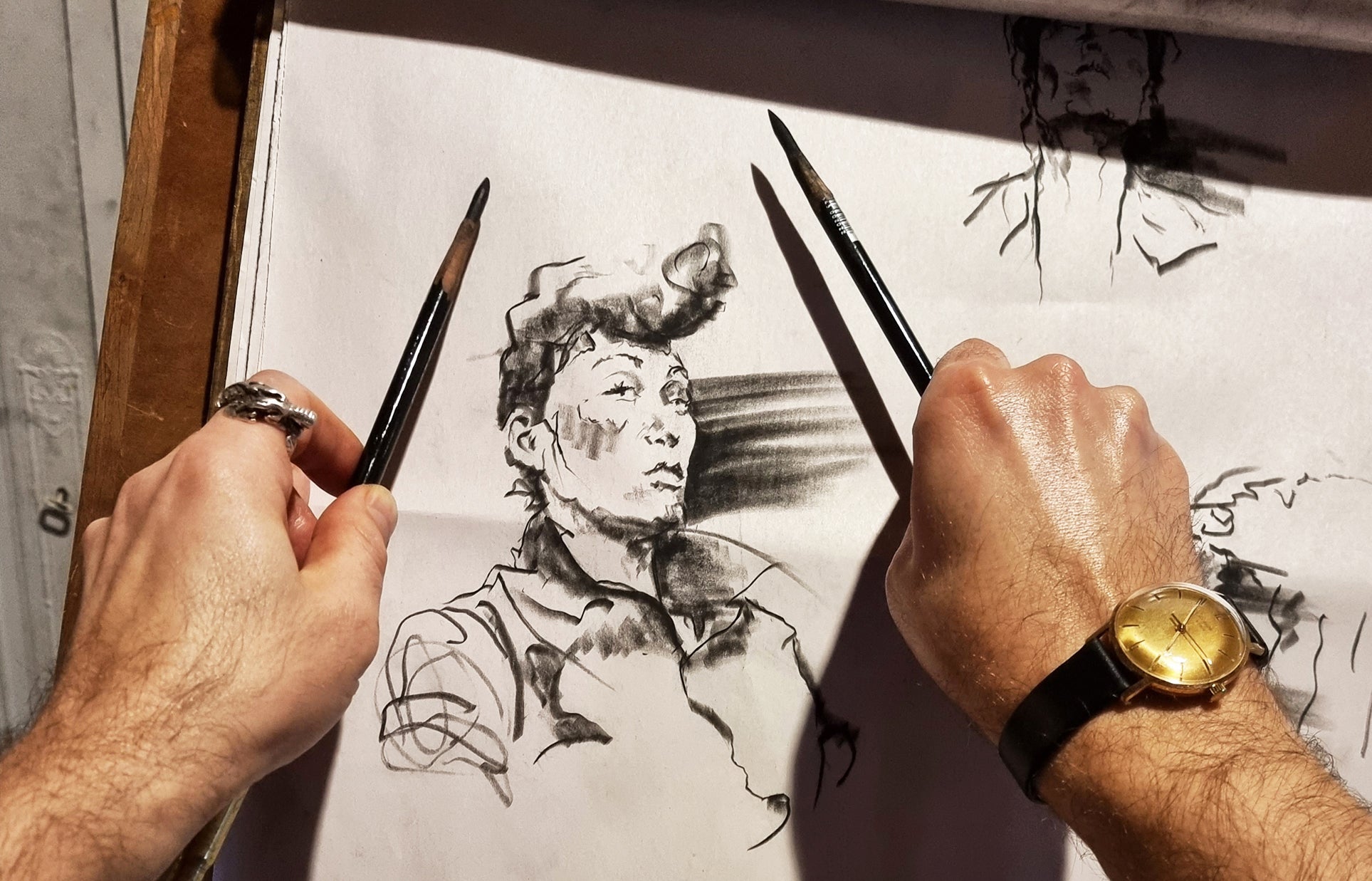 On Roman's portable easel, you will also discover capricious charcoal sketches: Witnesses of invisible anecdotes created during his excursions through the city. These first impressions of his artistic work are the aperitif of the final highlight of the tour: exploring his atelier, located in a historic building (1650) in the heart of the silk weavers' district.